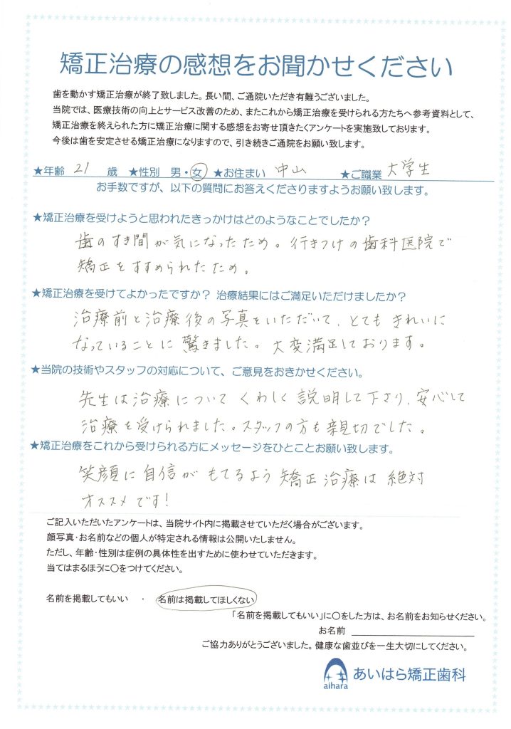 歯のすき間が気になったため。行きつけの歯科医院で矯正をすすめられたため。